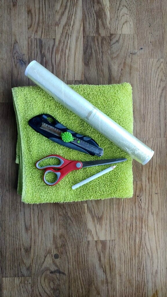 - Mały ręcznik, folia spożywcza (przezroczysta, elastyczna), taśma klejąca (pakowa / malarska) – do wykonania „główki” i szablonu bazy.